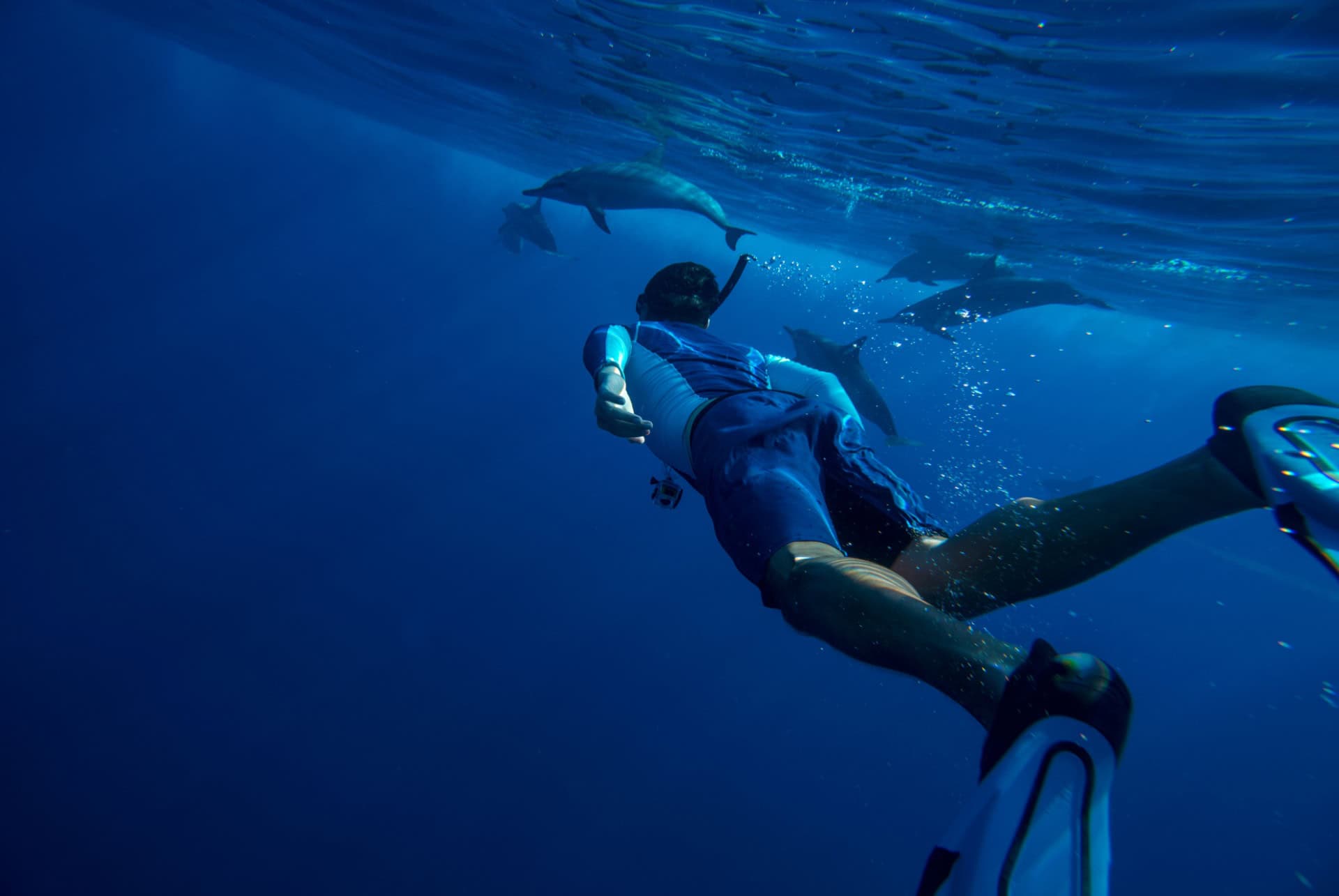 J'ai eu la chance de prendre part au « Sunrise Dolphin Encounter » de Vitamin Sea, une excursion pour nager avec les dauphins au lever du soleil, avec un départ à 5 h 30 ! L'horaire permet d'éviter le rush touristique et il y avait donc seulement 2/3 bateaux qui s’appelaient entre eux pour se tenir au courant de l’emplacement des dauphins.